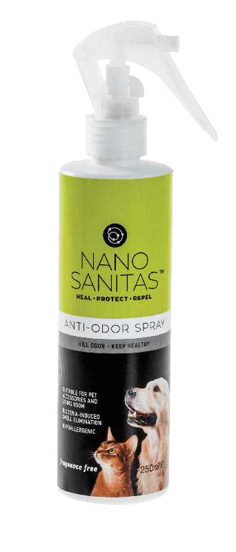 Hypoallergenic and eco-friendly, this water-based NanoSanitas solution is suitable to clean pet accessories and living space, while creating a hygiene environment for you and your pet. Our Anti-Odor Spray is free of solvents, preservatives and biocidal chemicals and thus non-toxic to humans and animals.